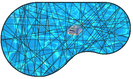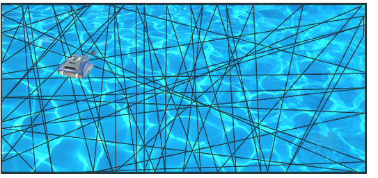 2時間での走行軌道です。動きが一見ランダムに見えても実はプール全体を隈なく動くよう、初めよりプログラミングされた軌道を走行するプールロボットです。ランダム走行では、動きはプールロボット任せですのでどうしても行きやすいところばかりに集中する傾向があり、満遍なく動くことはあまり期待できません。取り残しを少なくするという観点からは、ランダム走行ではなく軌道の約束されたプールロボットを選びたいものです。